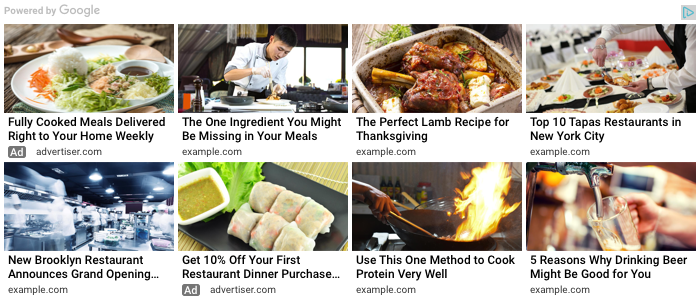 実際に関連コンテンツユニットを設置した時に表示されるのはこのようなものです。「Ad」っていうアイコンがついているものが外部サイトの広告で、それ以外がサイト内の記事になるようです。