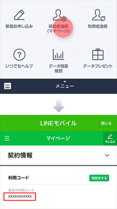 友だちになったLINEモバイル公式アカウントから「契約者連携(マイページ)」を押してマイページへアクセスして、「利用コード」をどこかにメモしてください。