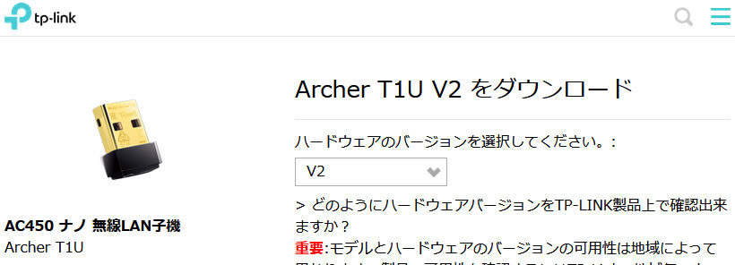 このページでハードウェアのバージョンを選択するのですが、どうやら「V2・V1」でダウンロードすべきものが違うようです。